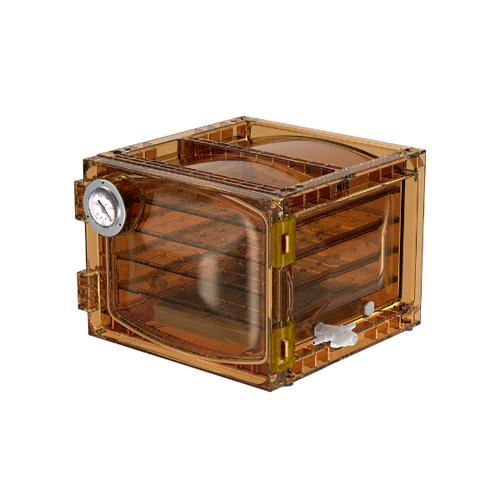 This transparent laboratory desiccator has a vacuum gauge displayed on its front door allowing users to easily check vacuum levels. With its stackable and space-saving design, samples can be placed efficiently inside the desiccator.