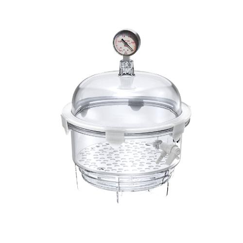 The built-in vacuum gauge on this laboratory desiccator allows fast and accessible analysis of the vacuum level.