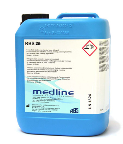 • Directions for use: Dilute 20ml of RBS 25 per litre of water (preferably at 50°C). For radioactive decontamination, increase the concentration to 100ml of RBS 25 per litre of water. For soaking, completely immerse the soiled items to ensure an optimal contact with the cleaning solution. Rinse immediately with tap water, or better, with demineralised water. RBS 25 is easily and totally eliminated without leaving any traces or invisible film. Remark: the use of an ultrasonic bath and/or an increase of the temperature of the cleaning solution may be of help in case of stubborn soils.